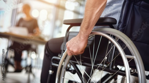 wheelchair, hand, wheel, mobility, disability, accessibility, support, care, medicals, equipment, indoor, man, adult, one person, sitting, male, chair, closeup, working, occupation, lifestyle, human hand, businessman, 1, man, woman, table, copy space, transportation, professional occupation, industry, seat, hospital, real people, selective focus, service, paraplegic, mature adult, physical injury, bicycle, casual clothes, businessperson, office, holding