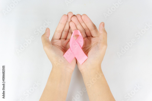 A hand hold Pink ribbon on white background. A Symbol of Breast cancer awareness, cancer awareness month.