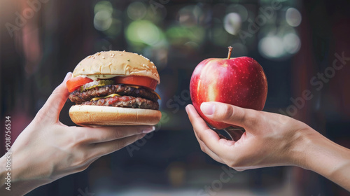 unhealthy, health food, burger, apple, hand, choice, fast food, vegetable, fruit, food, diet, natural, nourishment, lifestyle, hamburger, sandwich, fresh, meal, supply, useful, regime, dietary, holding, dilemma, versus, eating, health, snack, healthy, red, arm, juicy, organic, human, freshness, hand