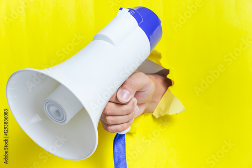 A hand holding a megaphone through a yellow wall, demonstrating loud communication