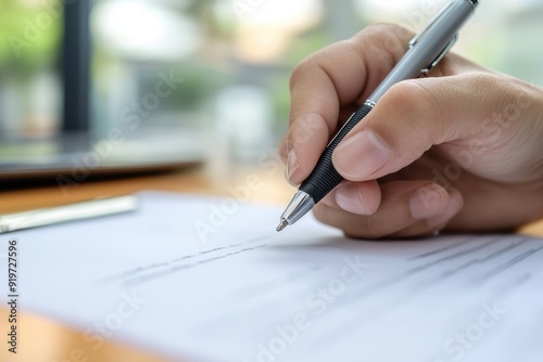 A hand holding a pen over a sheet of paper, ideal for concepts of writing, documentation, and creativity in a work environment.