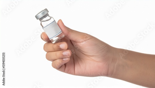 A hand holding a small vial, likely containing medication or a vaccine, with a clear label area for identification.