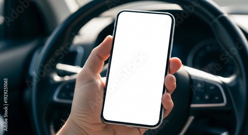 A hand holding a smartphone with a blank screen in a car with a steering wheel in the background