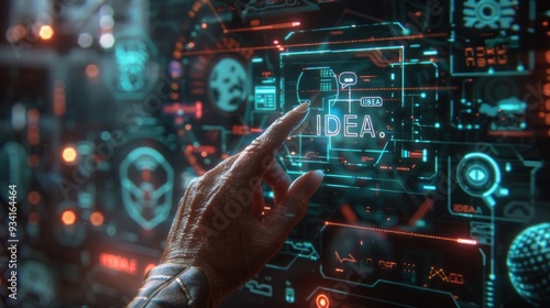 A hand holding "IDEA" as a holographic infographic in a digital landscape.