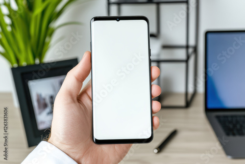 A hand holds a blank smartphone mockup in a contemporary office space featuring greenery and technology, suitable for showcasing design ideas