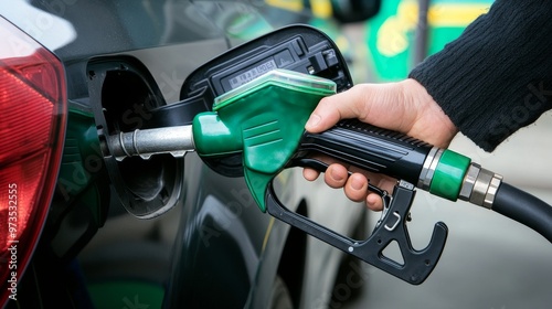 A hand holds a gasoline nozzle for refueling a car at a gas station, emphasizing the importance of fuel access and the convenience of modern transportation in everyday life