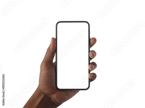 A hand holds a modern smartphone with a blank white screen, ready for content.