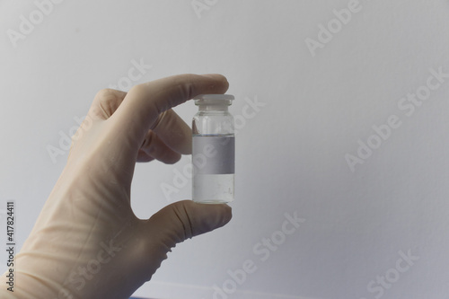 a hand in a white protective medical glove holds the vials of the vaccine close up on a blue background