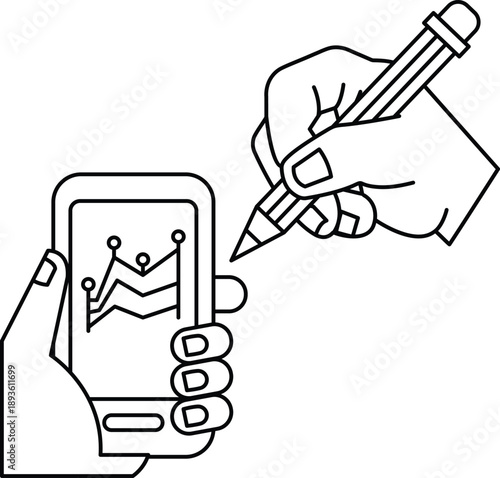hand, holding, mobile phone, phone, crayons, displaying, graph, technology, smartphone, using, screen, digital, concept, mobile, datum, illustration, vector, symbol, icon, business, touch, cyberspace, graphic, device, design, communication, line, white, smart, app, signs, art, background, outline, contraption, drawing, creative, person, contour, linear, finger, vignetting, continuous, electronic, single, idea