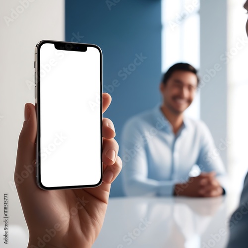 a hand is holding a phone with blank white screen is ready for mock-up and behind that a boy is smiling, his face is blurred.