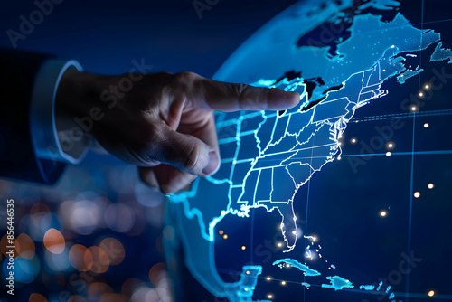 A hand points at the United States on a glowing digital globe, representing global connection and digital presence.