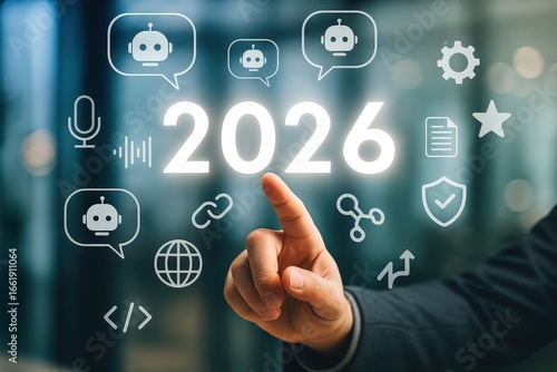 A hand points to the year 2026, surrounded by futuristic technology icons, highlighting the future of technology and innovation.