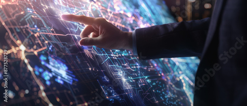 A hand touches a vibrant digital screen displaying complex data and glowing technology paths in a futuristic setting.
