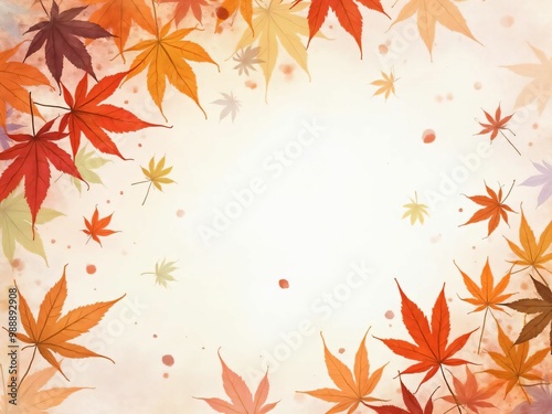 カエデ・紅葉した赤・緑・紫・オレンジの葉が白い背景の上に散らばって敷き詰められている水彩画風の手書き風のイラスト A hand-drawn watercolor-style illustration of maple leaves in red, green, purple, and orange autumn colors scattered and spread across a white