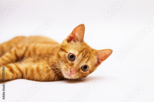 a handsome, cute, red, a small kitten lies on a white backdrop of c large eyes