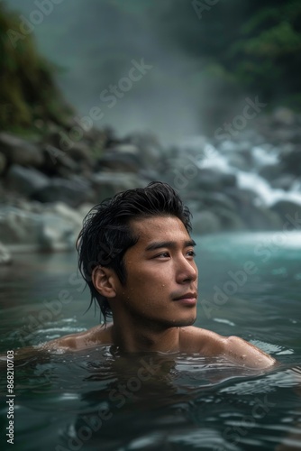 A handsome man bathe in a natural hot springs with steam rising, with a softly blurred background of rocky terrain and greenery.