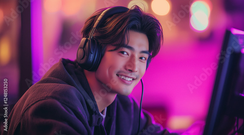 A handsome young Asian man wearing headphones is smiling while sitting in front of his computer, playing video games with friends at night. The scene is set against a backdrop of p