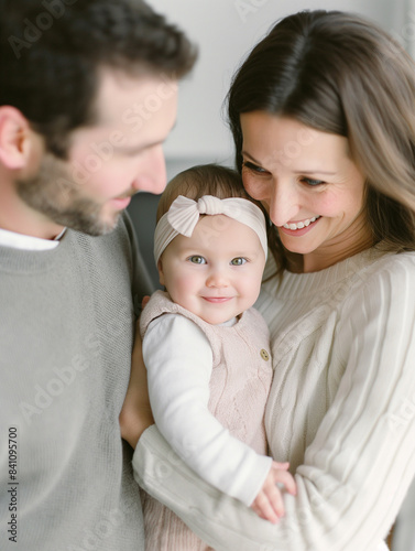 A happy family portrait with parents smiling at their baby, who is wearing a pink headband and looking at the camera.