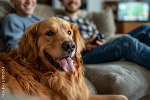 a happy golden retriever dog sitting comfortably on a sofa watching owner human playing games