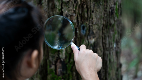 A happy little girl is exploring in the forest and looking for insects with a magnifying glass. Adventure tourism and learning concept.