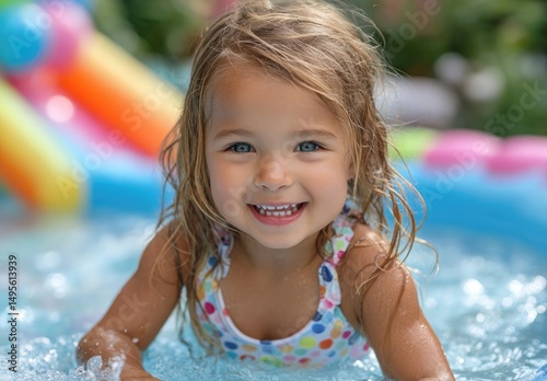 A happy little girl playing in an inflatable children's pool with a water slide in the garden during summer vacation.