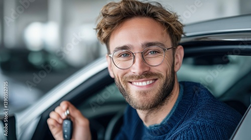 man, car, smile, happy, goggles, key, vehicle, automobile, portrait, joy, cheerful, success, ownership, driving, inside, transportation, luxury, buyer, new, client, dealer, purchase, selling, lifestyle, adult, photogenic, stylish, blue, sweater, hair, bearded, eyewear, round, optic, vision, face, confident, positive, pleased, satisfied, looking, camera, closeup, daylight, natural, light, studio, indoor, modern