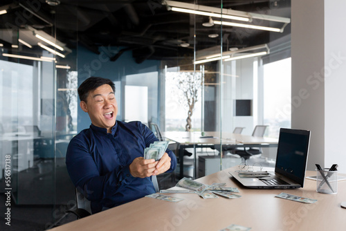 A happy young Asian man, an office worker, an entrepreneur holds cash money in his hands, received a salary, a bonus. He is sitting at a table in the office, rejoices, shouts with joy.
