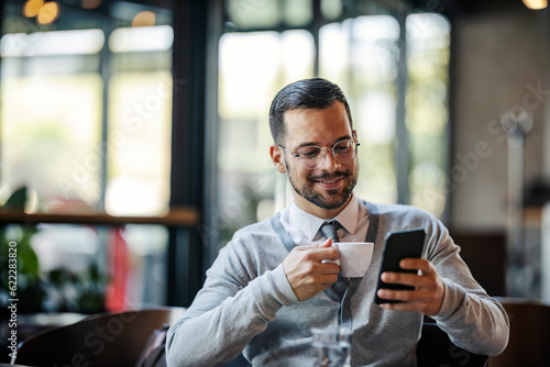 A happy young elegant man is drinking coffee in cafe and using his phone.