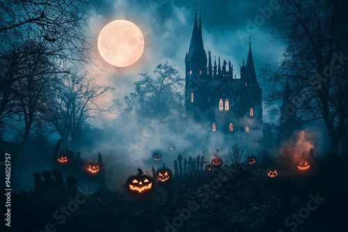 A haunted castle with numerous jack-o-lanterns glowing under a full moon, surrounded by fog and spooky trees.
