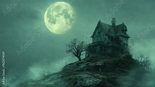 A haunted house on a hill with a full moon in the background ? space for text