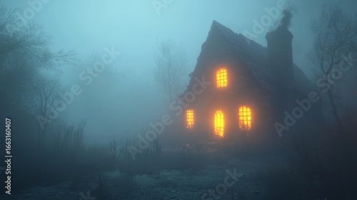 A haunted house with glowing windows and eerie fog surrounding it