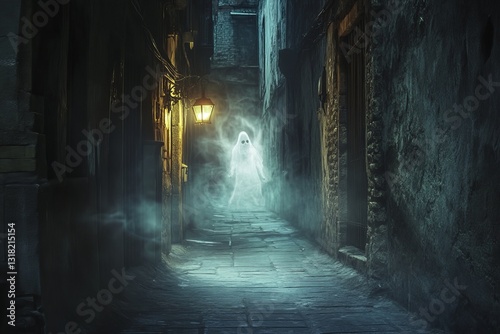 A haunting ghostly figure emerges in a dark and foggy alley, illuminated by a dim lantern. The eerie atmosphere evokes mystery and intrigue.