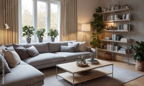 living room, interior, cosy, comfortable, inviting, warm, relaxing, bookshelf, coffee table, artwork, houseplant, window, large, natural light, sofa, blanket, rug, peaceful, serene, comfy, snug, homelike, interior design, living space, home decor