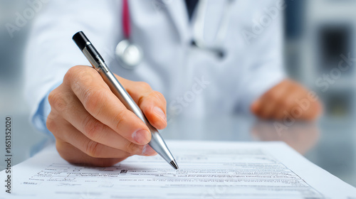 A healthcare professional fills out a form, emphasizing the importance of documentation in the medical field for patient care.