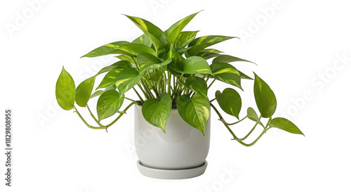 A healthy green pothos plant in a white pot with a saucer