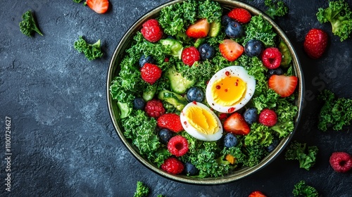salad, kale, strawberry, blueberry, raspberry, cucumber, egg, boiled egg, healthy, food, diet, meal, breakfast, lunch, dinner, vegan, vegetarian, organic, fresh, raw, green, red, blue, healthy eating, nourishment, vitamin, mineral, protein, fiber, antioxidant, delicious, tasty, appetising, colourful, vibrant, natural, rustic, dark, grey, background, bowl, plate, topview, overhead, closeup, macro, still life, photo