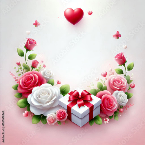 A heart-shaped arrangement of pink and white roses, a white gift box tied with a red ribbon. The background is a soft gradient, transitioning from light pink to white, enhancing the romantic theme