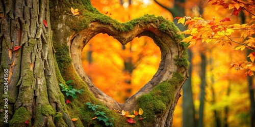 A heart-shaped tree trunk with a natural opening in the center, surrounded by lush green foliage and vibrant autumn leaves , foliage, leafy greens
