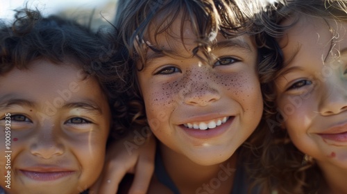 A heartwarming close-up of three smiling kids with varied hair textures, faces close together