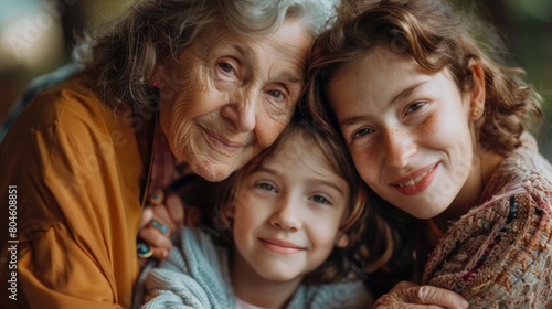 A heartwarming image of an older woman and two young girls embracing. Perfect for family-themed designs