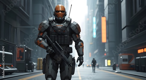 A heavily armored futuristic soldier standing in a neon-lit city street, holding a sci-fi rifle and wearing an advanced helmet with an orange visor.