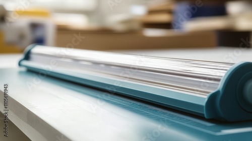 A heavy-duty paper cutter with a protective safety guard that shields the blade when not in use.