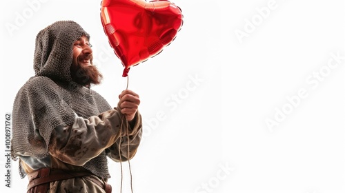 A heroic knight holds a heart-shaped balloon, perfect for romantic occasions or whimsical themes