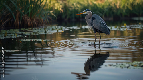 A heron standing in a shallow river, its long legs and graceful neck reflected in the calm water, with a blurred background of reeds and lily pads.
