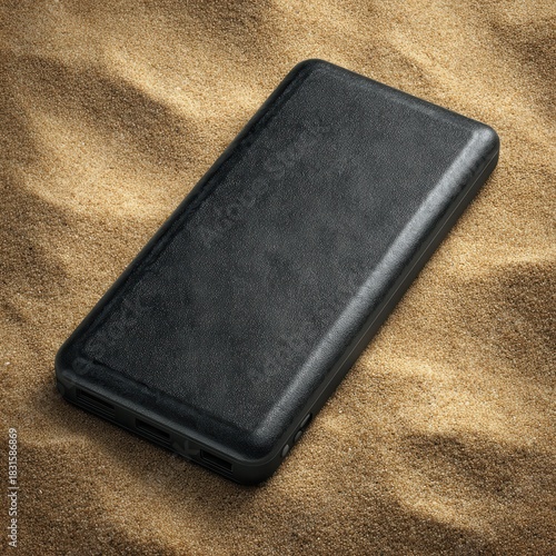 A high angle close up of a black portable charger with a glittery texture resting on fine golden sand.