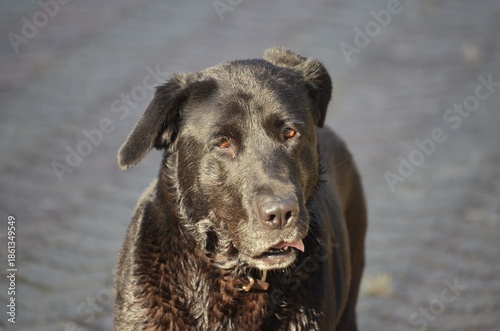A high angle of a cute black retriever dog standing on the concrete floor