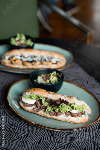 A high angle of two sandwich with meat, eggs, vegetables, and sliced red onion on green plate