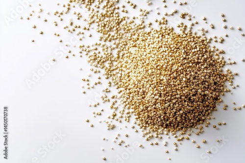 A high-angle shot showcasing a cluster of golden quinoa grains set against a pristine white backdrop.