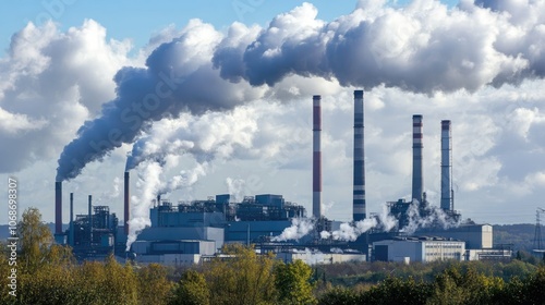 A high-angle view of a large industrial complex with smoke rising from the chimneys, symbolizing heavy industry