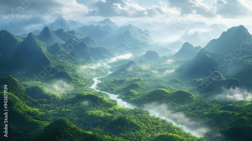 A high-angle view of a lush green valley surrounded by misty mountains, with a winding river cutting through the landscape, creating a serene and breathtaking panorama